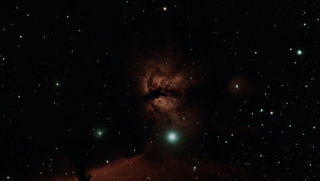 The flame Nebula is an emission nebula located approximately 900 light years away in the constellation of Orion. The nebula is made to luminesce by the nearby eastern most star in Orion’s belt.